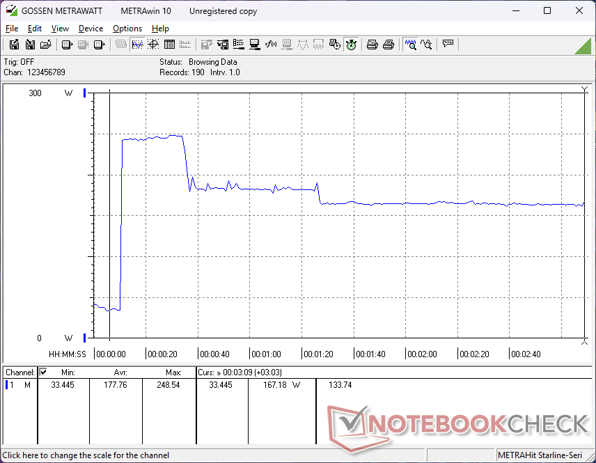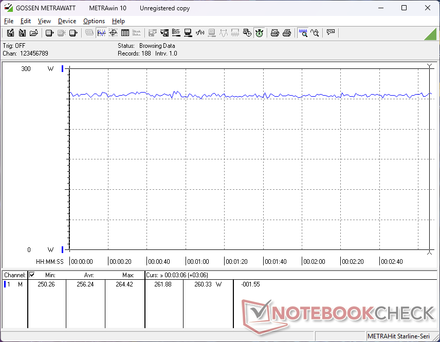 Praca na biegu jałowym może pobierać od 6 W do 32 W przy ustawieniu maksymalnej jasności z aktywnym oddzielnym GPU. To minimum jest niższe niż w przypadku większości innych 18-calowych laptopów, co wyjaśnia stosunkowo długi czas pracy na baterii w następnej sekcji.