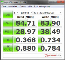 Zastosowany przez Della dysk twardy Western Digital Scorpio Blue (WD3200BPVT-75ZEST0) działa z prędkością 5400 obr/min i korzysta z interfejsu SATA II. Jego wydajność nie jest zbyt wysoka, biorąc pod uwagę taki sobie czas dostępu (19,9 ms wg HD Tune i 18,8/15,8 ms wg AS SSD) oraz prędkość zapisu i odczytu w wysokości maksymalnie 83,9 i 84,7 MB/s (wg programu CrystalDiskMark).