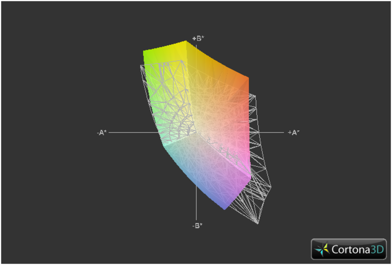 Niestety szczegółowe badanie kolorymetrem wykazało znaczne odstępstwa od ideału gammy 2,2, zbyt wysoką wartość czerni, a także nieduży zakres wyświetlanych barw (większy niż w Acerze 5750G, ale mniejszy niż w Asusie N53SV, o przestrzeni sRGB nawet nie wspominając). Minusem są również nie najszersze kąty widzenia.