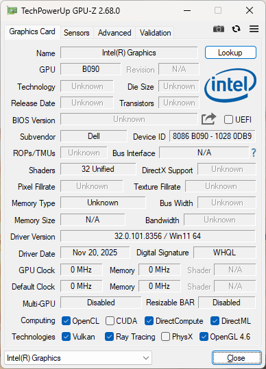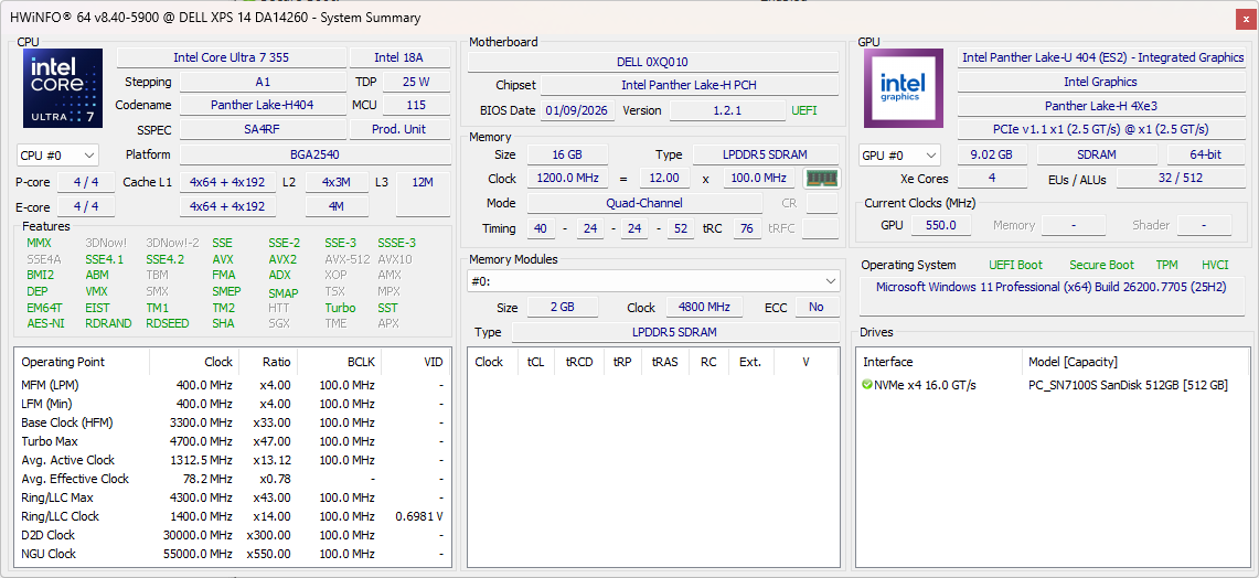 | Dell XPS 14 Core Ultra 7 355 Intel Core Ultra 7 355 ⎘ Intel Graphics 4 Xe3 Panther Lake iGPU ⎘ 16 GB Pamięć, 512 GB SSD | Amazon: Cena katalogowa: 1600 USD | 1.5 kg | 15.2 mm | 14.00" 1920x1200 162 PPI IPS | |