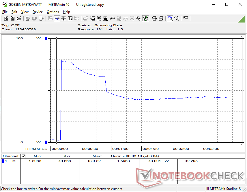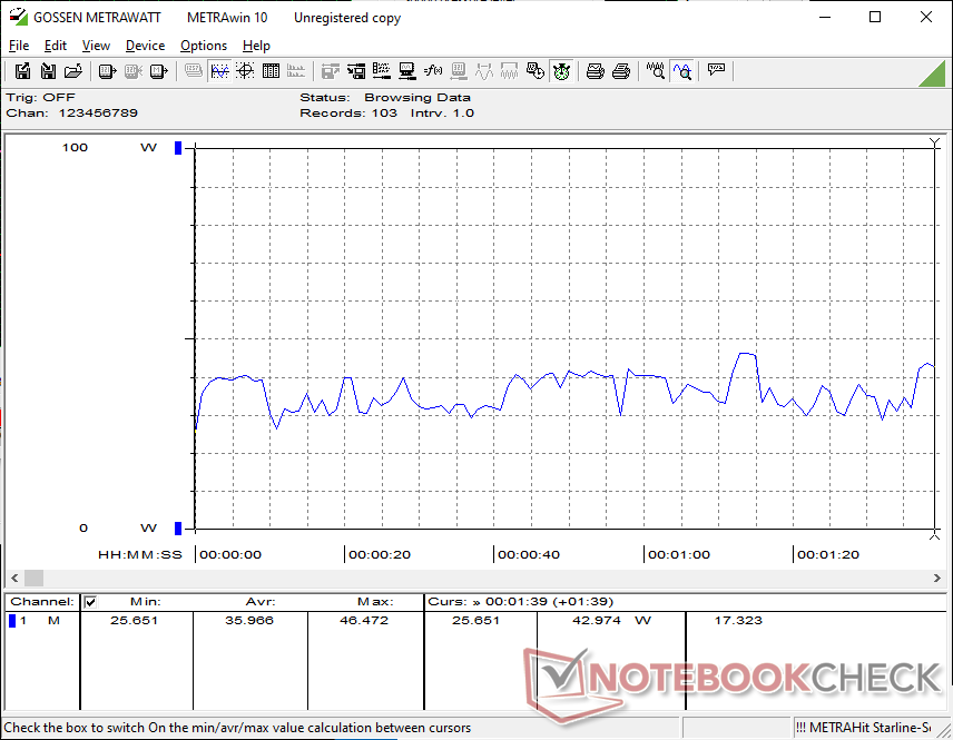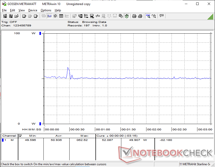 Uniwersalny zasilacz sieciowy USB-C o mocy 100 W jest poza tym identyczny we wszystkich konfiguracjach XPS 14 2026. Ponieważ jednak potencjał Turbo Boost jest niższy w przypadku Core Ultra 7, jesteśmy w stanie osiągnąć maksymalny pobór tylko 80 W, gdy procesor jest w pełni obciążony, w porównaniu do 101 W w konfiguracji Core Ultra X7.