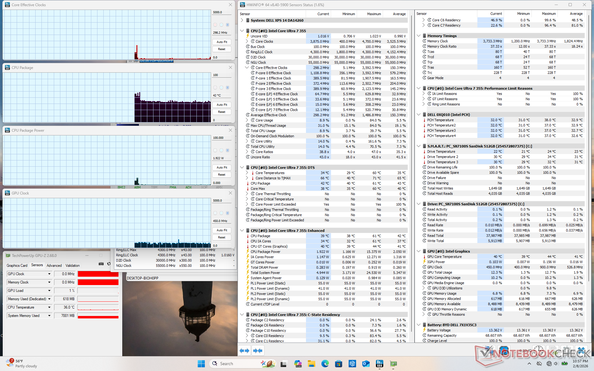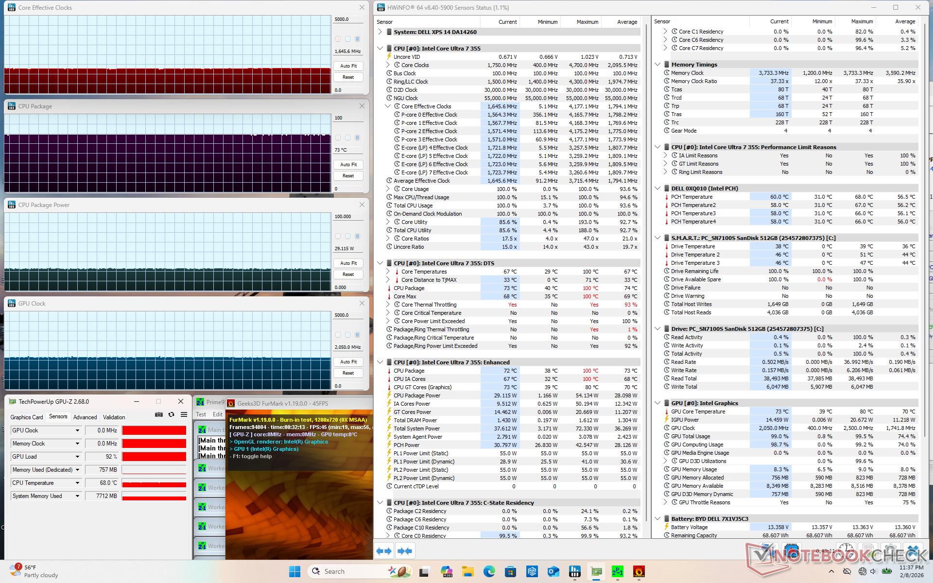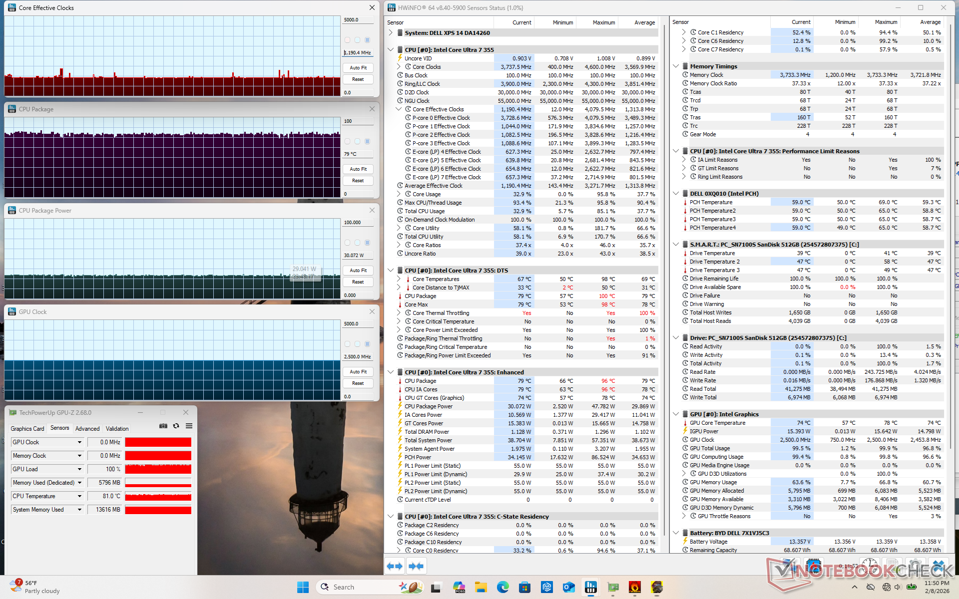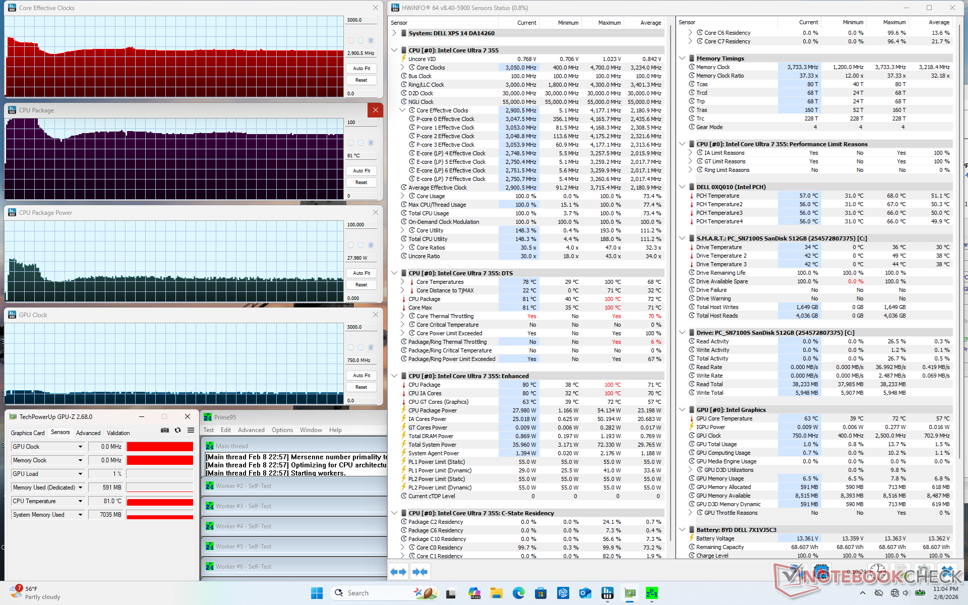 Po uruchomieniu obciążenia Prime95, procesor zwiększał taktowanie do 3,7 GHz i 54 W, utrzymując się przez zaledwie kilka sekund w temperaturze 100 C. Następnie stabilizował się na poziomie 2,9 GHz, 28 W i 81 C, reprezentując ograniczony potencjał Turbo Boost. Temperatura rdzenia osiągnęłaby plateau w dolnym zakresie 80 C podczas uruchamiania wymagających obciążeń, co jest nieco chłodniejsze niż to, co zarejestrowaliśmy na zeszłorocznym Arrow Lake-H Dell 14 Premium.