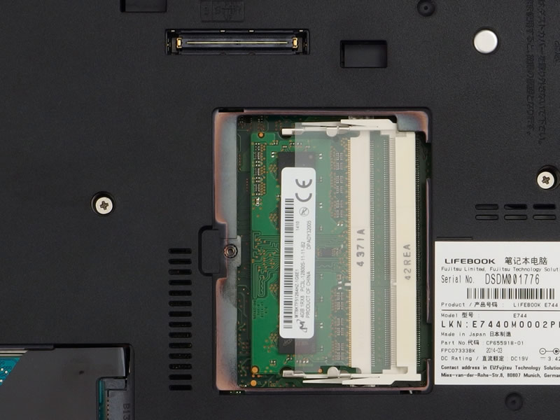Fujitsu LifeBook E744 posiada dwie niewielkie klapki serwisowe dające dostęp do pamięci operacyjnej oraz pamięci masowej. Aby dostać się do pozostałych podzespołów, potrzebna jest głębsza ingerencja.