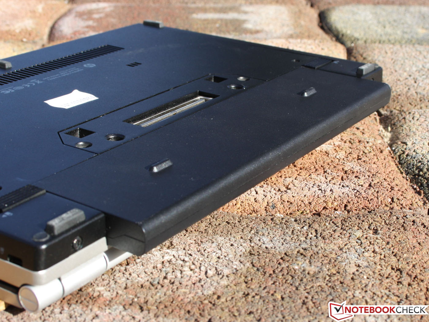 Z tyłu znajduje się wystający poza obrys obudowy akumulator, a złącza zewnętrzne zostały umieszczone na ściankach bocznych laptopa.
