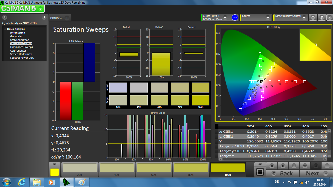 Parametry matrycy HD nie zachwycają. Średnia luminancja przy maksymalnej intensywności podświetlenia wyniosła tylko 201,8 cd/m². Średni błąd DeltaE 2000 w odwzorowaniu kolorów to aż 12,51 (pożądane byłoby, żeby nie przekraczał 3). Obraz był totalnie zaniebieszczony. Zdecydowaną poprawę przyniosła kalibracja. W jej wyniku średni błąd DeltaE 2000 dla kolorów osiągnął 4,16. Kalibracja pomogła też pozbyć się zaniebieszczenie obrazu. Pokrycie przestrzeni kolorów Adobe RGB wyniosło 34,9%, a przestrzeni sRGB - 50,3%.