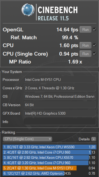 W programie Cinebench R15 Intel Core M-5Y51 uzyskał 81 pkt. w teście renderowania jednowątkowego i 144 pkt. w teście wielowątkowym. Wyniki te są nieco lepsze od tych uzyskanych przez starszy, energooszczędny Intel Pentium N3530, który wypracowuje średnio odpowiednio 39 i 130,5 pkt., ale też bez porównania gorsze od osiąganych przez procesory o wyższym TDP. Muszę w tym miejscu zaznaczyć także, że przy dużym obciążeniu występował potężny efekt dławienia częstotliwości taktowania, które spadały do 500 MHz.