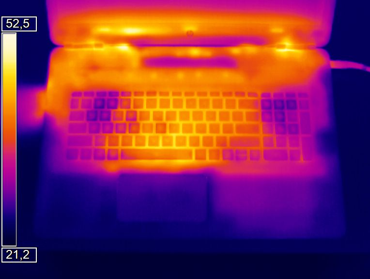 (+) Podpórki pod nadgarstki i touchpad są chłodniejsze niż temperatura skóry i maksymalnie 29.8 °C / 85.6 F i dlatego są chłodne w dotyku.