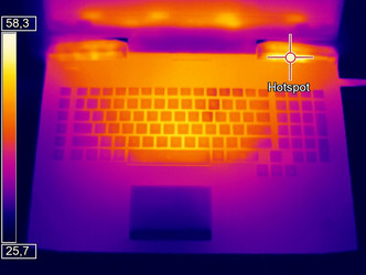 Temperatury nie wyglądają najlepiej. W teście bez obciążenia były dużo wyższe, niż w starszym Omenie 17. Karta GTX 1070 jest cały czas aktywna. Na spodzie zmierzono maksymalnie 37°C. W teście gry Wiedźmin 3 spód rozgrzał się do 50°C. W teście pełnego obciążenia na spodzie stwierdzono maksymalnie 54°C a na wierzchu jednostki zasadniczej - 48°C. Pozytywne jest to, że w testach obciążeniowych nie nagrzewały się nadmiernie miejsca oparcia dłoni. Poważnym problemem są natomiast wysokie temperatury klawiatury.