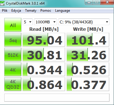 Wydajnościowo przeciętnie wypada dysk twardy dostarczony przez Hitachi. Ma on 500 GB pojemności, 8-megabajtowy bufor i prędkość obrotową 5400 obr/min. Średni transfer przy odczycie w teście w HD Tune to 78,6 MB/s.