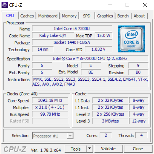 Procesor Core i5-7200U to jeden z najpopularniejszych przedstawicieli rodziny Kaby Lake montowanych w laptopach biznesowych. Jednostka CPU dysponuje dwoma fizycznymi rdzeniami a dzięki wsparciu dla technologii HT istnieje możliwość wykorzystania czterech wątków równolegle. Bazowe taktowanie procesora wynosi 2,5 GHz (w trybie Turbo może rosnąć do wartości 3,1 GHz). Układ wykonano w procesie technologicznym 14 nm.