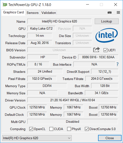 W sprawdzianie 3DMark 11 moc obliczeniową chipu graficznego Intel HD 620 (korzystającego z dwukanałowego trybu działania pamięci RAM) oceniono na 1597 punktów. W teście laptopa HP PB 650 G2 układ HD Graphics 520 wypracował 1257 punktów. Wydajność ogólna w teście 3DMark 11 Performance została oceniona na 1784 pkt. ProBook 650 G2 zdobył w tym sprawdzianie 1380 pkt.