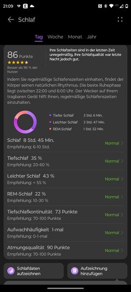 Całkowity czas snu jest również nagradzany gwiazdkami i punktami oraz porównywany z wynikami innych użytkowników. Dane mogą być również wyświetlane nie tylko dla jednej nocy, ale także dla tygodnia, miesiąca, a nawet roku. Aplikacja Huawei oferuje również różne pejzaże dźwiękowe, które mają ułatwić zasypianie.