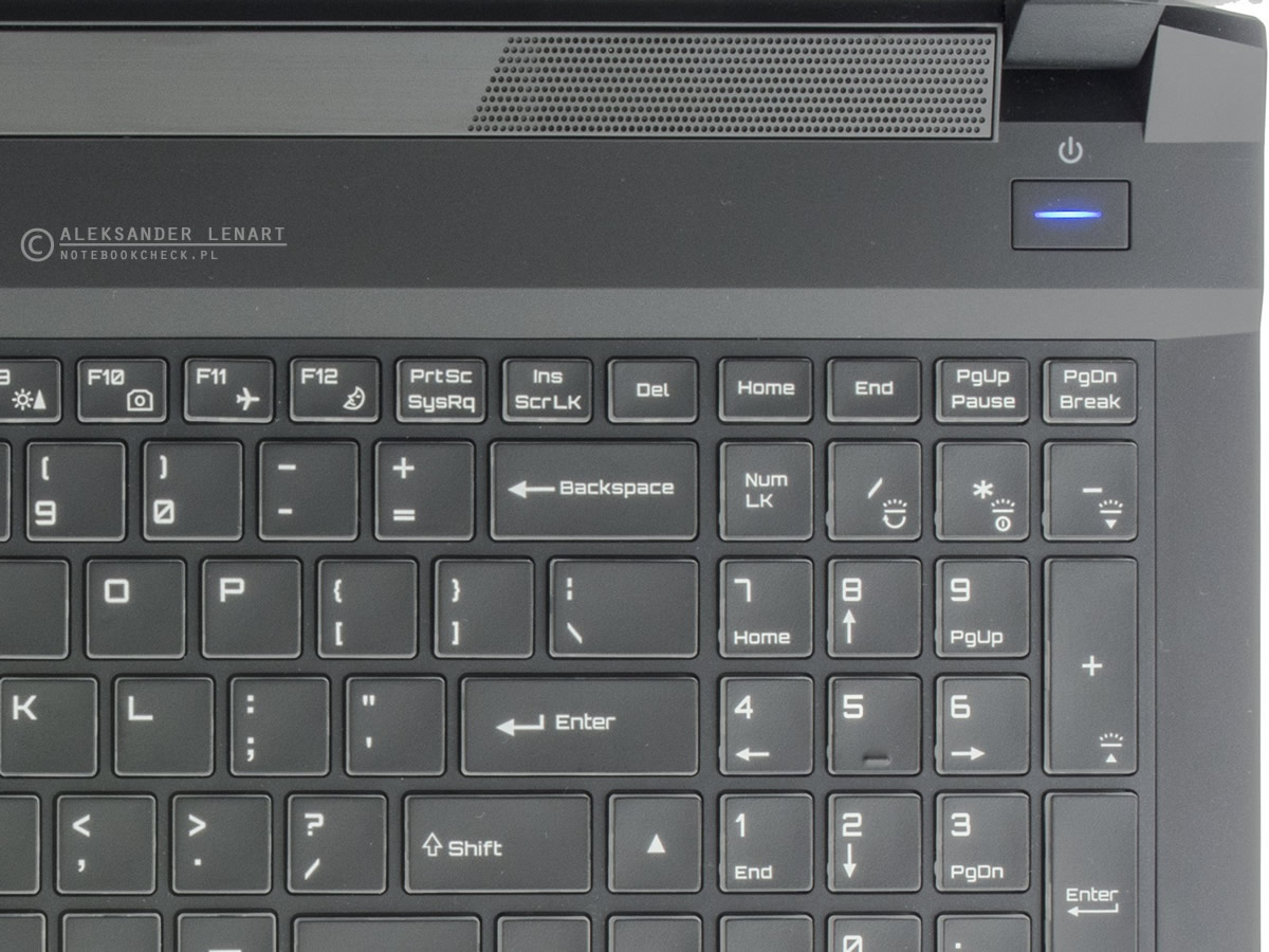 Hyperbook SL502 VR został wyposażony w bardzo interesujący model klawiatury. W moim odczuciu przypomina ona bardziej klawiatury MSI, niż te, które były montowane w starszych modelach Clevo. Spodnia część klawiszy jest półprzeźroczysta, dzięki czemu podświetlenie wygląda znacznie lepiej, niż w laptopach konkurencji. Warto w tym miejscu także podkreślić fakt, iż omawiana klawiatura dysponuje wielobarwnym podświetleniem, które przy pomocy dołączonej aplikacji można skonfigurować. Nie mogę także pominąć możliwości sterowania intensywnością podświetlenia z poziomu skrótów klawiszowych (można czterostopniowo regulować jasność podświetlenia lub je wyłączyć). Klawisze działają z dość długim, miękkim skokiem. Ich głośność jest raczej przeciętna. Na pochwałę zasługuje sztywne podparcie klawiatury zapobiegające ugięciom podczas pisania. Klawiatura SL502 VR dysponuje dość przyzwoitym blokiem numerycznym, ale poza lekkim zwężeniem klawiszy numerycznych napiętnować muszę także prawy klawisz kierunkowy umieszczony w miejscu, w którym znajdować się powinien klawisz „0”. Pod względem blokad kombinacji trzech jednocześnie wciskanych klawiszy jest wręcz idealnie. Podczas testów odkryłem tylko dwie, nieistotne właściwie blokady: