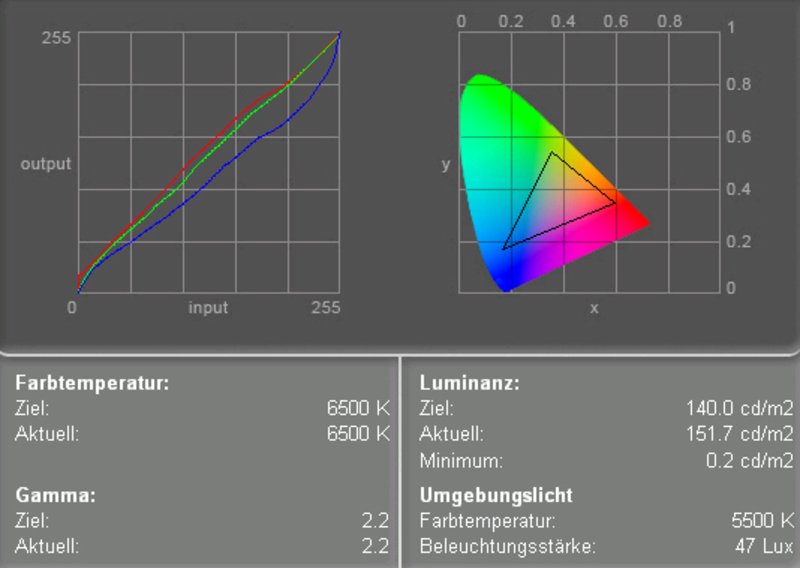 Diagram kolorometryczny pokazuje nieco niespokojny przebieg krzywych oraz wyraźne odchylenie od ideału tej niebieskiej. Jest to odzwierciedlenie pewnej nadreprezentacji barw ciepłych w odwzorowywanym obrazie.
