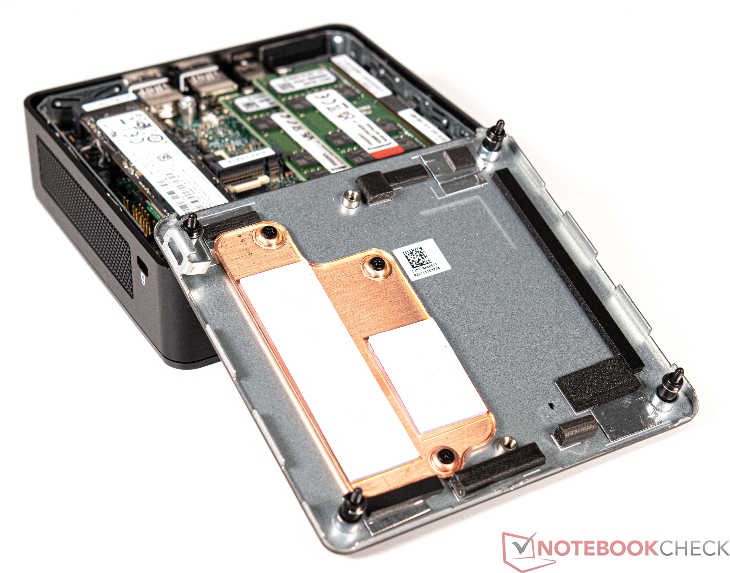 Zestaw Intel NUC 13 Pro jest stosunkowo łatwy do otwarcia. Dolna pokrywa, która pomaga również odprowadzać ciepło z dysku SSD, jest utrzymywana w miejscu przez cztery śruby. Zdjęcie dolnej pokrywy zapewni Ci bardzo wygodny dostęp do znajdujących się pod nią gniazd pamięci RAM i SSD.