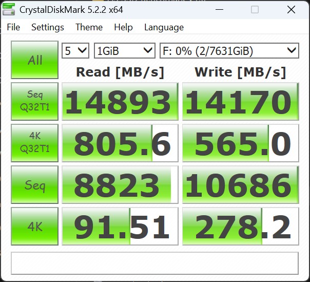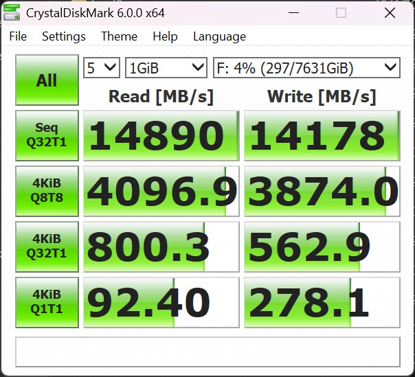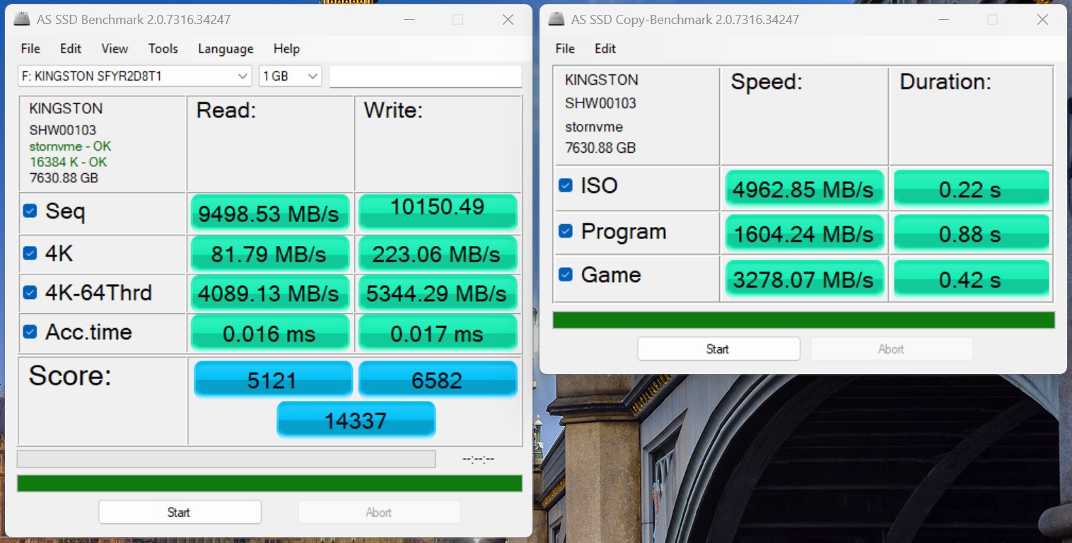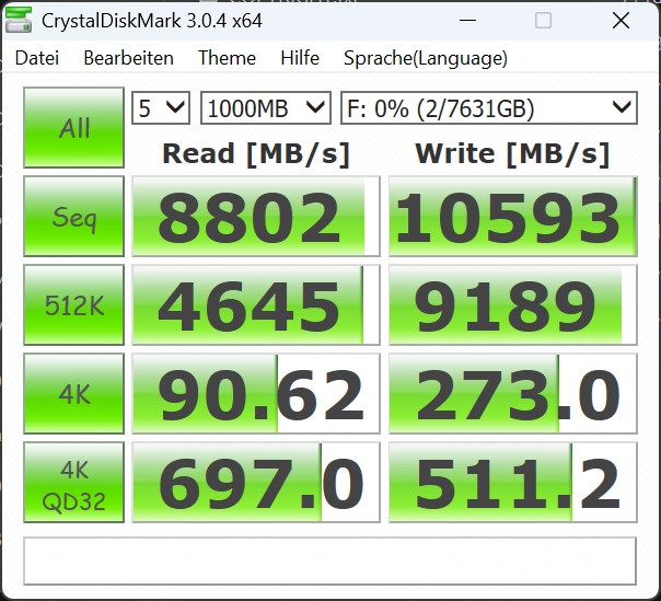 W naszym systemie testowym dysk Kingston Fury Renegade G5 o pojemności 8 TB mógł niemal w pełni wykorzystać swój ogromny potencjał wydajnościowy. W benchmarku CrystalDiskMark 6 zmierzyliśmy sekwencyjne prędkości odczytu na poziomie ponad 14 900 MB/s i zapisu na poziomie około 14 200 MB/s. Zgodnie z oczekiwaniami, wyniki w benchmarku AS-SSD są nieco niższe. W bezpośrednim porównaniu z innymi wewnętrznymi dyskami SSD klasy high-end, Fury Renegade G5 wyraźnie wyprzedza konkurencyjne modele, takie jak Samsung 9100 Pro czy Kingston KC3000.