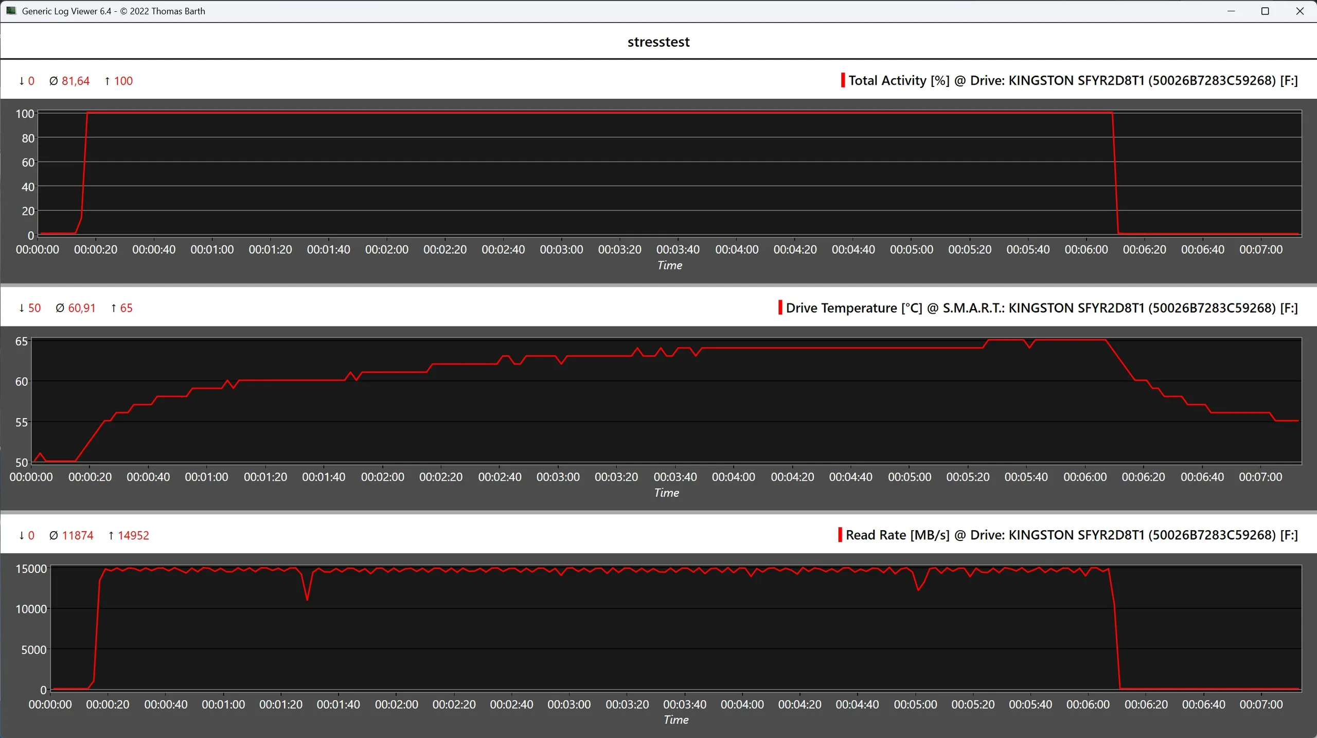 W teście wytrzymałości Diskspd, dysk SSD również wykazuje w dużej mierze stałą wydajność. Chociaż od czasu do czasu występują niewielkie wahania wydajności, nie ma znaczącego spadku w całym okresie testowym. Ze średnią ponad 14 000 MB/s, Kingston Fury Renegade G5 imponuje również przy długotrwałym obciążeniu. Podczas gdy obie wersje Kingston Fury Renegade G5 zapewniają imponującą wydajność, model 8 TB osiąga lepsze wyniki niż wersja 4 TB z nieco bardziej stałymi prędkościami odczytu przy ciągłym obciążeniu. Wymaga to jednak odpowiedniego chłodzenia: w połączeniu z radiatorem zastosowanej płyty głównej ASRock sprawdziło się to w teście znakomicie. W kompaktowych systemach, takich jak laptopy lub mini PC, wyższe temperatury mogą jednak prowadzić do znacznie większych spadków wydajności przy ciągłym obciążeniu.