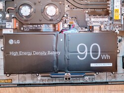 Duże litery na akumulatorze głoszą, że jego pojemność wynosi 90 Wh. Jest to wysoka wartość dla wielu laptopów, ale znakomita dla tego, który waży tylko 1,4 kg. W teście przeglądania stron internetowych przez WiFi czas pracy wyniósł ponad 14 godzin. Również w codziennym użytkowaniu LG Gram 17 może łatwo zarządzać więcej niż jeden pełny dzień roboczy bez konieczności podłączania. Inne konfiguracje tego laptopa, jak np LG Gram 17Z90Q-G.AA56Gmuszą się zadowolić akumulatorem o pojemności 80 Wh.
