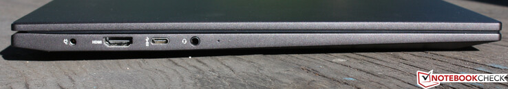 Do laptopa można podłączyć maksymalnie dwa wyświetlacze zewnętrzne (przez HDMI i DisplayPort). Podobnie jak w przypadku grama 16 z procesorem Intela, Ultra PC nie obsługuje Thunderbolt 4, co oznacza, że jest kompatybilny co najwyżej ze stacjami dokującymi USB-C 3.1. Zasilanie może być dostarczane do laptopa przez stację dokującą, o ile obsługuje ona 65-watowy power pass-through. Porty po lewej i prawej stronie są umieszczone w kierunku tyłu laptopa, co pozwala na utrzymanie obszarów obok oparcia dłoni wolnych od kabli.
