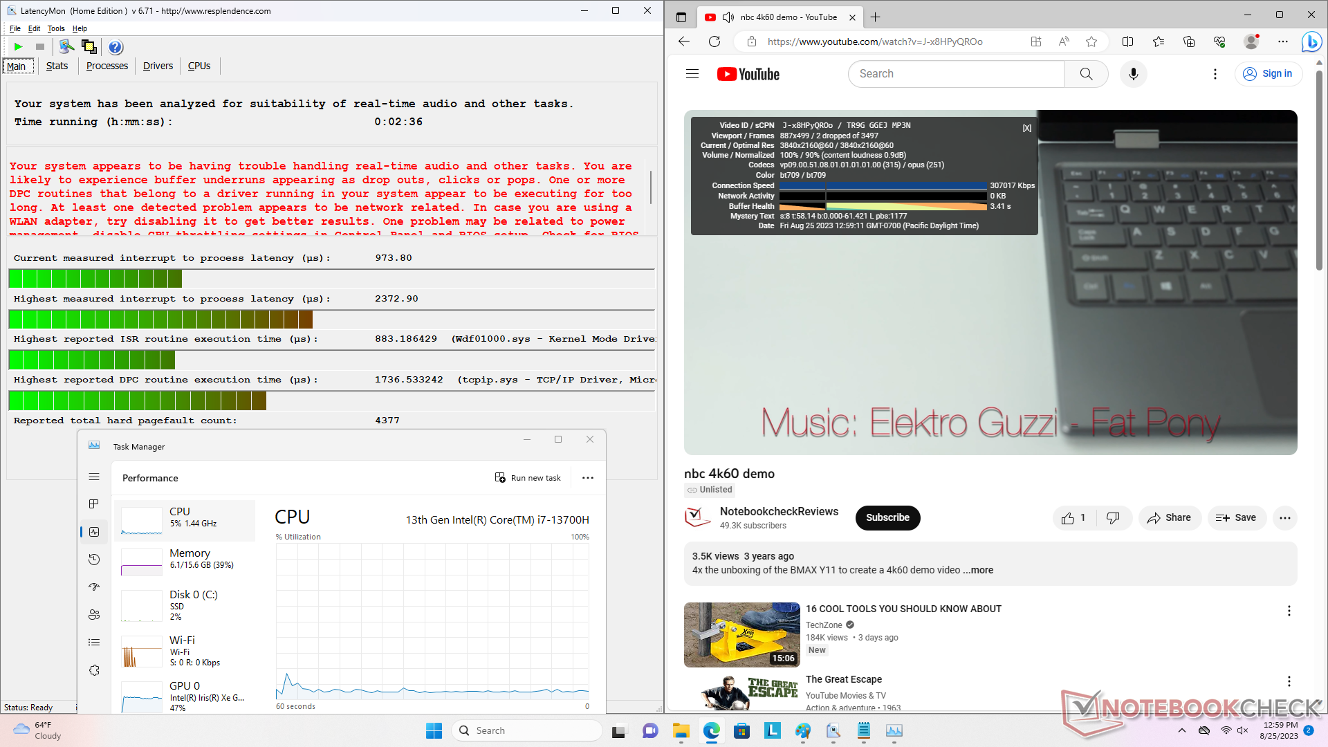 LatencyMon ujawnia problemy z DPC podczas otwierania wielu kart przeglądarki na naszej stronie głównej. Dodatkowo jesteśmy w stanie zarejestrować 2 spadki klatek podczas 60-sekundowego odtwarzania wideo 4K przy 60 FPS. Chociaż 2 klatki są ledwo zauważalne, 0 zrzuconych klatek jest idealne i bardziej powszechne na innych komputerach.