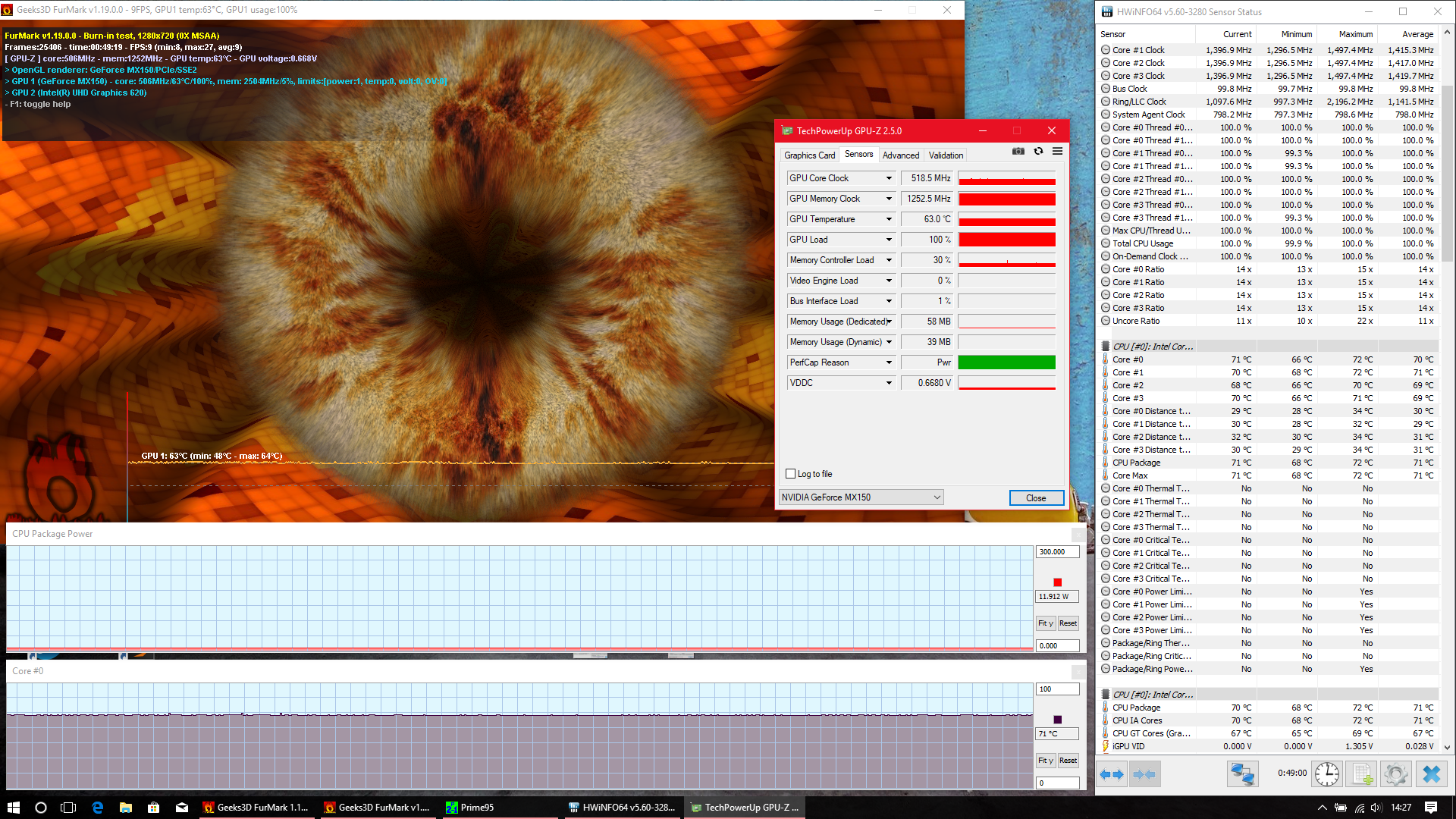 W teście aplikacji Prime95 i FurMark doszło do dużego zduszenia taktowania CPU i GPU. Taktowanie procesora spadło natychmiast do 1,5 GHz a taktowanie karty grafiki - do około 520 MHz. Temperatura CPU osiągnęła w tym teście maksymalnie 72°C a temperatura GPU doszła do 64°C.