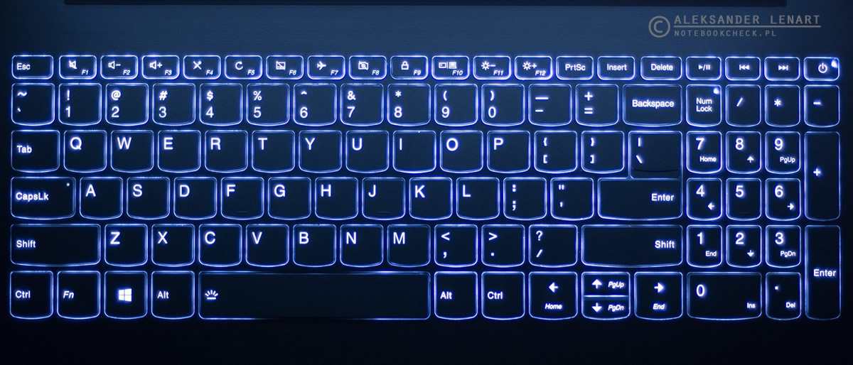 Klawiatura wyspowa zastosowana w modelu IdeaPad 330 zapewnia komfort podczas pisania. Klawisze mają dość duże płytki (z wyjątkiem strzałek góra/dół) a ich układ oraz rozmieszczenie są bardzo poprawne. Narzekać można na nieco zwężone klawisze bloku numerycznego. Pochwalić zaś należy sztywność podparcia klawiatury oraz kulturę pracy klawiszy, które działają cicho, z miękkim, raczej krótkim skokiem i stosowną odpowiedzią. Klawiatura dysponuje podświetleniem, co w przypadku pracy w nocy może być całkiem użyteczne. Podświetlenie to ma białą barwę i jest jednostopniowe.