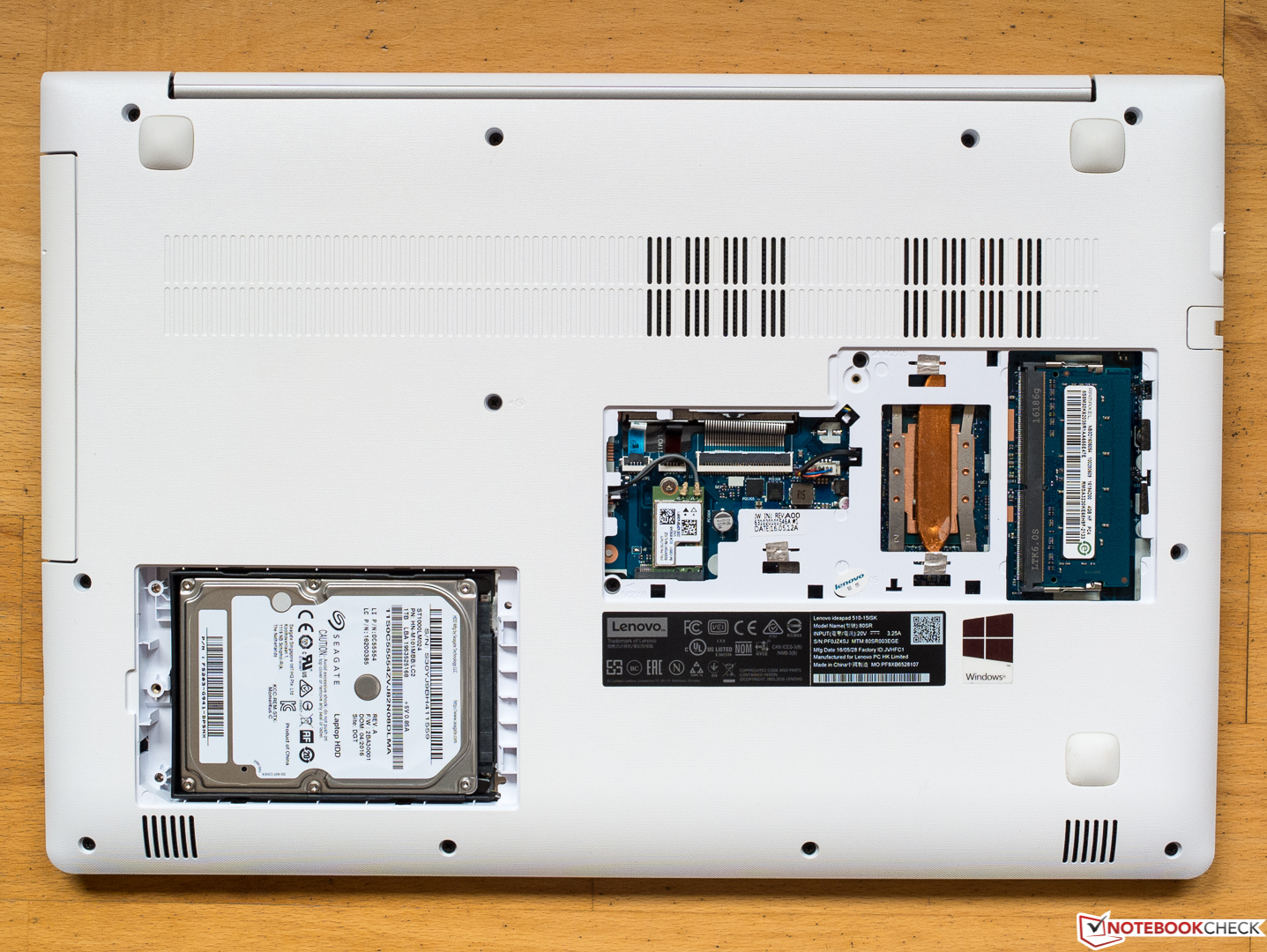 Na spodzie znajdują się dwie pokrywy serwisowe; każda z ich jest umocowana jedną śrubką. Dają one dostęp do dysku, karty Wi-Fi i gniazd pamięci RAM.