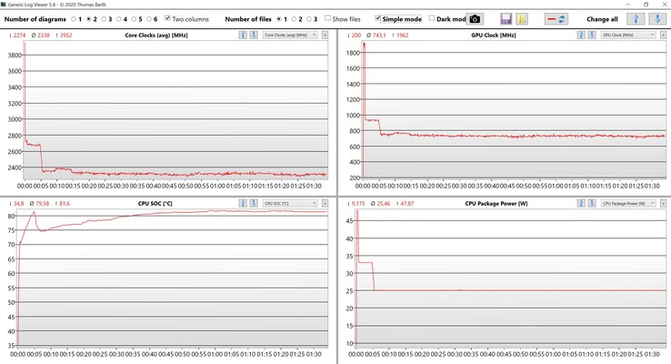 W codziennych sytuacjach nie ma problemów z temperaturą, ale w grach lub pod dużym obciążeniem po raz kolejny daje o sobie znać negatywna strona chłodzenia jednowentylatorowego. Na naszych zdjęciach termowizyjnych wyraźnie widać, że nagrzewa się tylko lewa strona obudowy, a przy szczytowej temperaturze około 50°C w lewym rogu, odradzamy umieszczanie urządzenia na kolanach w tym ekstremalnym scenariuszu. W teście obciążeniowym SoC szybko wyrównał poziom do 25 W, a następnie pozostał stabilny na tym poziomie.