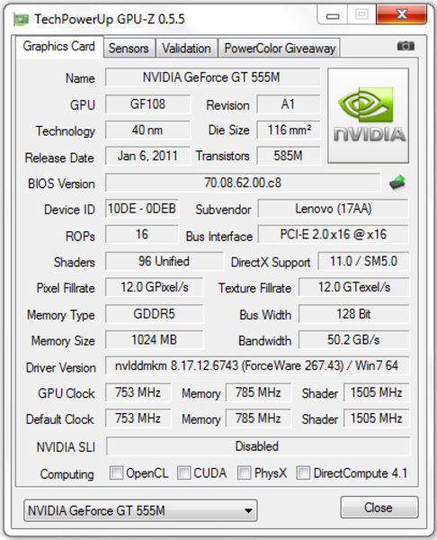 Karta GeForce GT 555M to szczególny przypadek w ofercie Nvidii. Obok wersji ze 144 procesorami CUDA, z różnymi typami pamięci (DDR3 i GDDR5) i z różnymi magistralami (192-bitowa lub 128-bitowa) oznaczenie to otrzymał również układ znacząco od nich odbiegający, a mianowicie posiadający tylko 96 jednostek cieniujących, pamięć VRAM GDDR5 i magistralę 128-bitową. To właśnie on znalazł się na wyposażeniu Lenovo Y570.