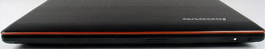 Prawa ścianka laptopa, na której umieszczono napęd optyczny, gniazdo zasilania i blokadę Kensingtona, byłaby idealna, gdyby nie dwa porty USB ulokowane przed napędem. Minusem omawianego modelu jest brak gniazda ExpressCard, które było na wyposażeniu Y560.