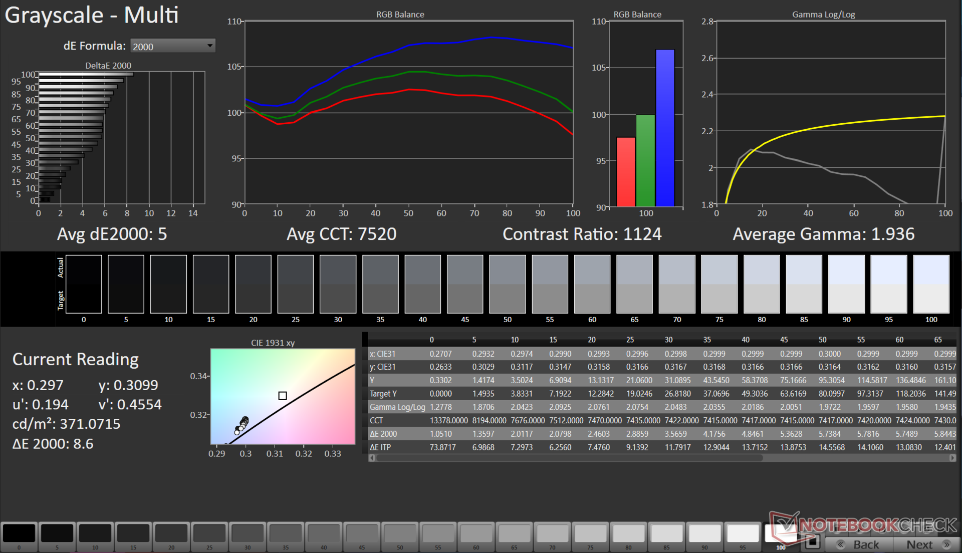 | Greyscale dE 2000 * | 5 | 1.13 77% | 2.6 48% | 1.5 70% | 1.03 79% | 1.7 66% | 6.2 -24% | 2.5 50% |