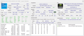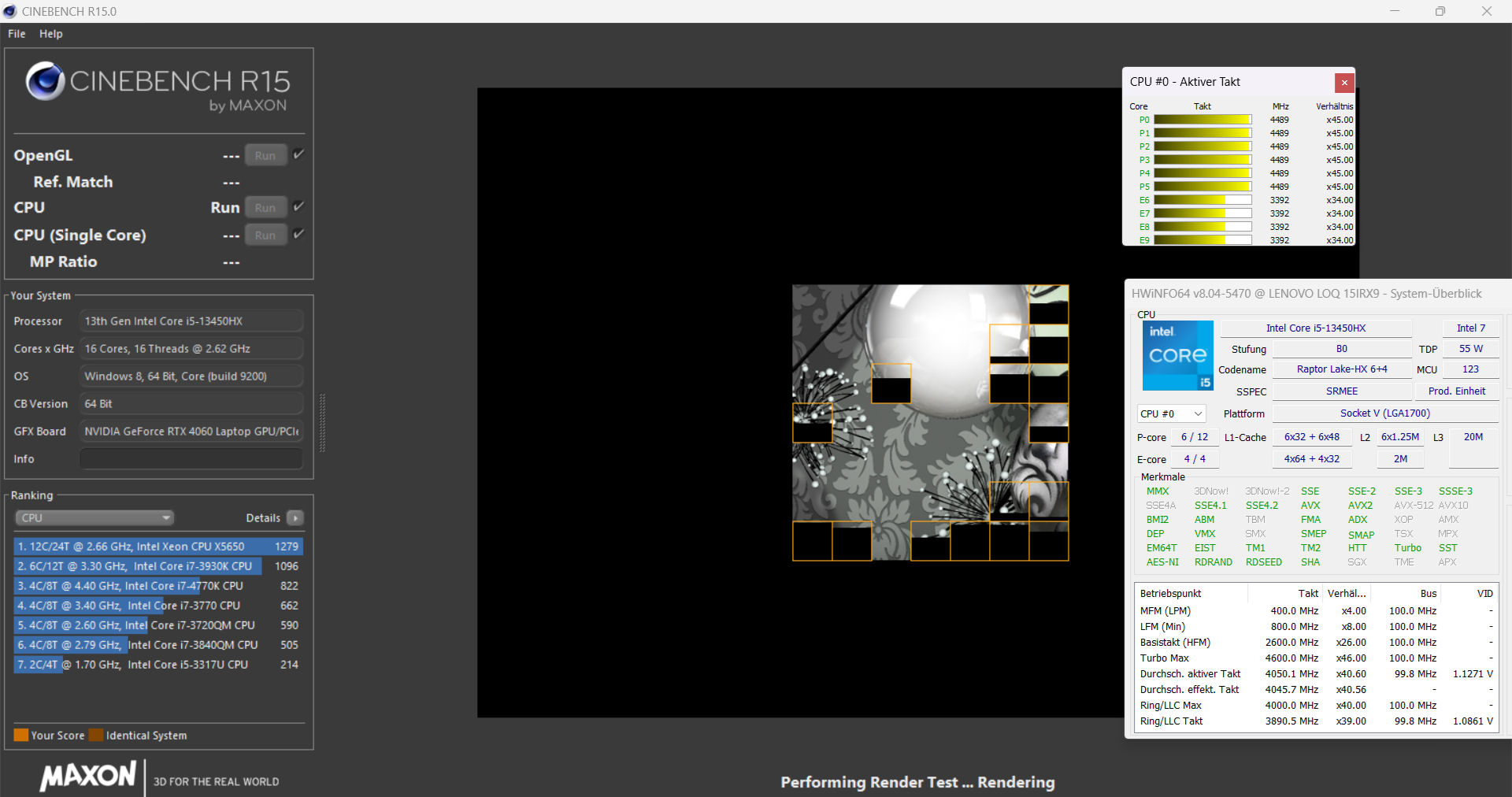 Procesor Core i5-13450HX(Raptor Lake) z 10 rdzeniami CPU (6P + 4E = 16 wątków) osiąga maksymalne częstotliwości taktowania na poziomie 4,6 GHz (P) i 3,4 GHz (E). Ciągłe obciążenie wielowątkowe (CB15 Loop) spowodowało spadek częstotliwości taktowania od pierwszego do czwartego uruchomienia( trybzrównoważony ). Później pozostała stabilna. Tryb wydajności utrzymuje częstotliwość taktowania na stale wysokim poziomie.