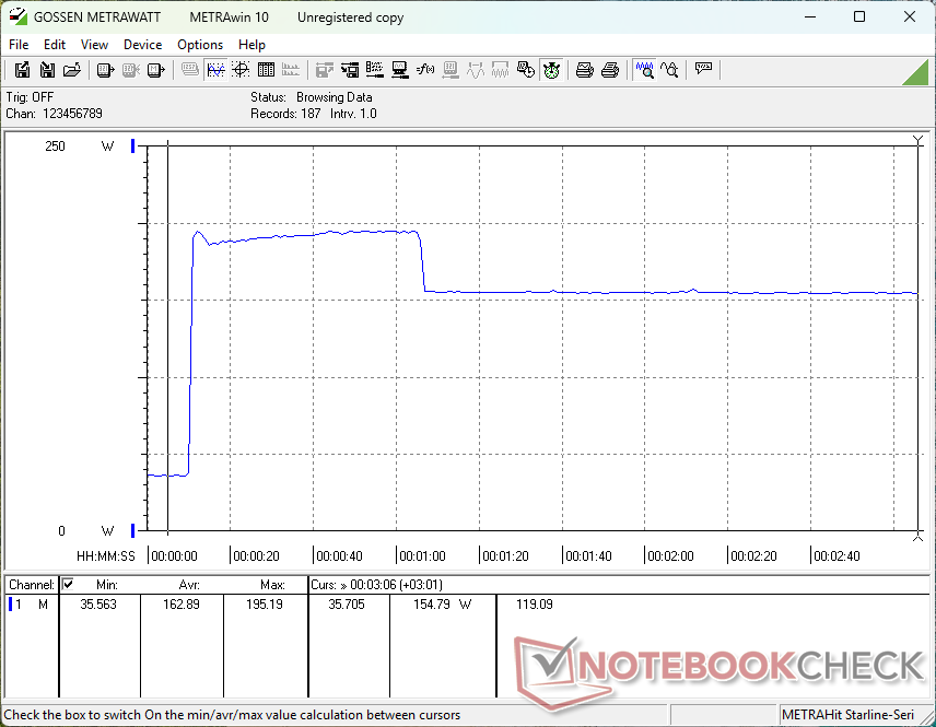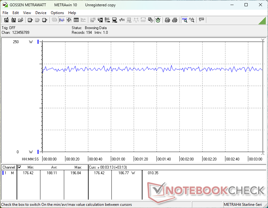 Ogólne zużycie energii jest dość wymagające jak na laptopa z RTX 5060, ponieważ większość innych laptopów z tym samym GPU nie jest zazwyczaj dostarczana z procesorami z serii Core-HX. Na przykład Alienware 16 Aurora wymaga zaledwie 123 W podczas uruchamiania Cyberpunk 2077 w porównaniu do naszych 188 W. Nawet napędzany przez AMD Razer Blade 16 ze znacznie wydajniejszym procesorem graficznym RTX 5080 wymagałby zaledwie 4 procent więcej mocy przy ogromnym wzroście wydajności w grach od 60 do 90 procent w porównaniu z naszym Legion 7 16.