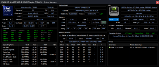 Lenovo Legion 7 16IAX10 Intel Core Ultra 7 255HX ⎘ Nvidia GeForce RTX 5060 Laptop ⎘ 32 GB Pamięć, 1024 GB SSD | Amazon: $2,349.00 Cena katalogowa: 1650 USD | 2 kg | 17.9 mm | 16.00" 2560x1600 189 PPI OLED | |