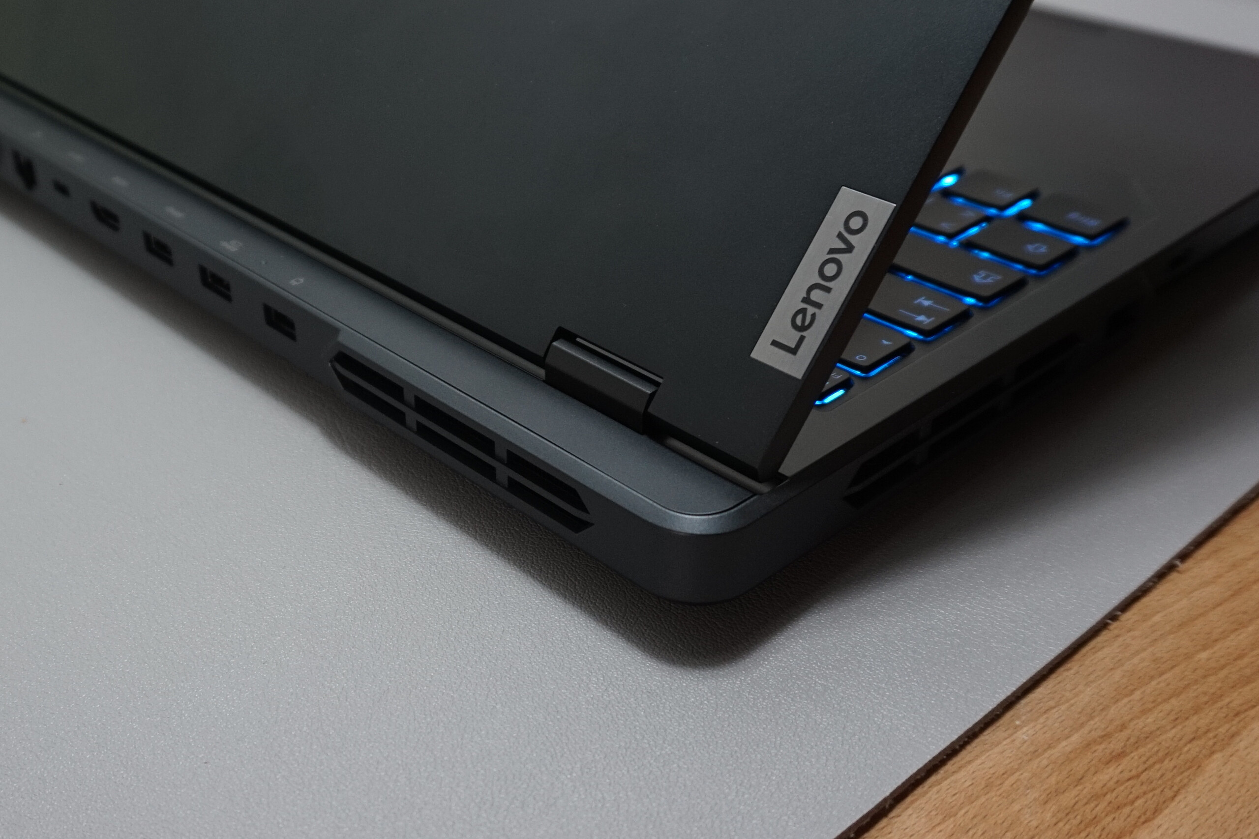 Podobnie jak w przypadku Legion Pro 5 16IRX8, laptop nie ma portów Thunderbolt. Można się tego jednak spodziewać po modelu opartym na platformie AMD. To powiedziawszy, urządzenie oferuje trzy wyjścia wideo i może być ładowane przez port USB-C z tyłu, choć ta metoda ładowania nie zapewnia pełnej mocy wymaganej do gier. Poza tym, Legion Pro 5 jest wyposażony w dużą liczbę i różnorodność portów. Na pokładzie nie ma czytnika kart.