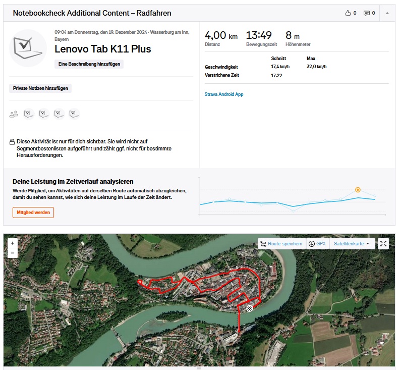 Lenovo Tab K11 obsługuje wszystkie ważne usługi nawigacji satelitarnej, takie jak GPS, Glonass, Galileo i Beidou. Wersja 4G zawiera również A-GPS. Podczas naszego testu był w stanie dość dokładnie zlokalizować nas na mapie, niezależnie od tego, czy przebywaliśmy w jednym miejscu przez długi czas, czy też podróżowaliśmy rowerem. W porównaniu do smartwatcha fitness Garmin Venu 2, który jest znany ze swoich precyzyjnych zdolności lokalizacyjnych, tablet Lenovo nie wypadł gorzej. Chociaż od czasu do czasu pojawiały się pewne drobne nieścisłości, nie były one znaczące w szerszej perspektywie.