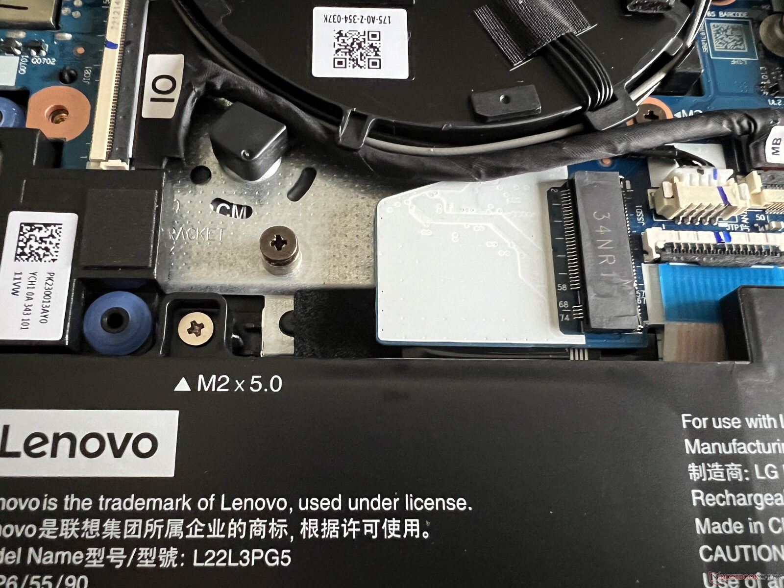 Dolna pokrywa jest zabezpieczona kilkoma śrubami krzyżakowymi, które można jedynie poluzować, ale nie całkowicie odkręcić. Płyta bazowa jest również przymocowana za pomocą plastikowych haczyków i jest bardzo ciasna. Płytę można zdjąć za pomocą odpowiednich narzędzi, ale trzeba uważać, aby nie złamać żadnych haczyków. Wewnątrz znajdziemy wentylator, slot pamięci RAM obok wlutowanej pamięci RAM (pod dodatkową pokrywą) oraz wymienny moduł WLAN.