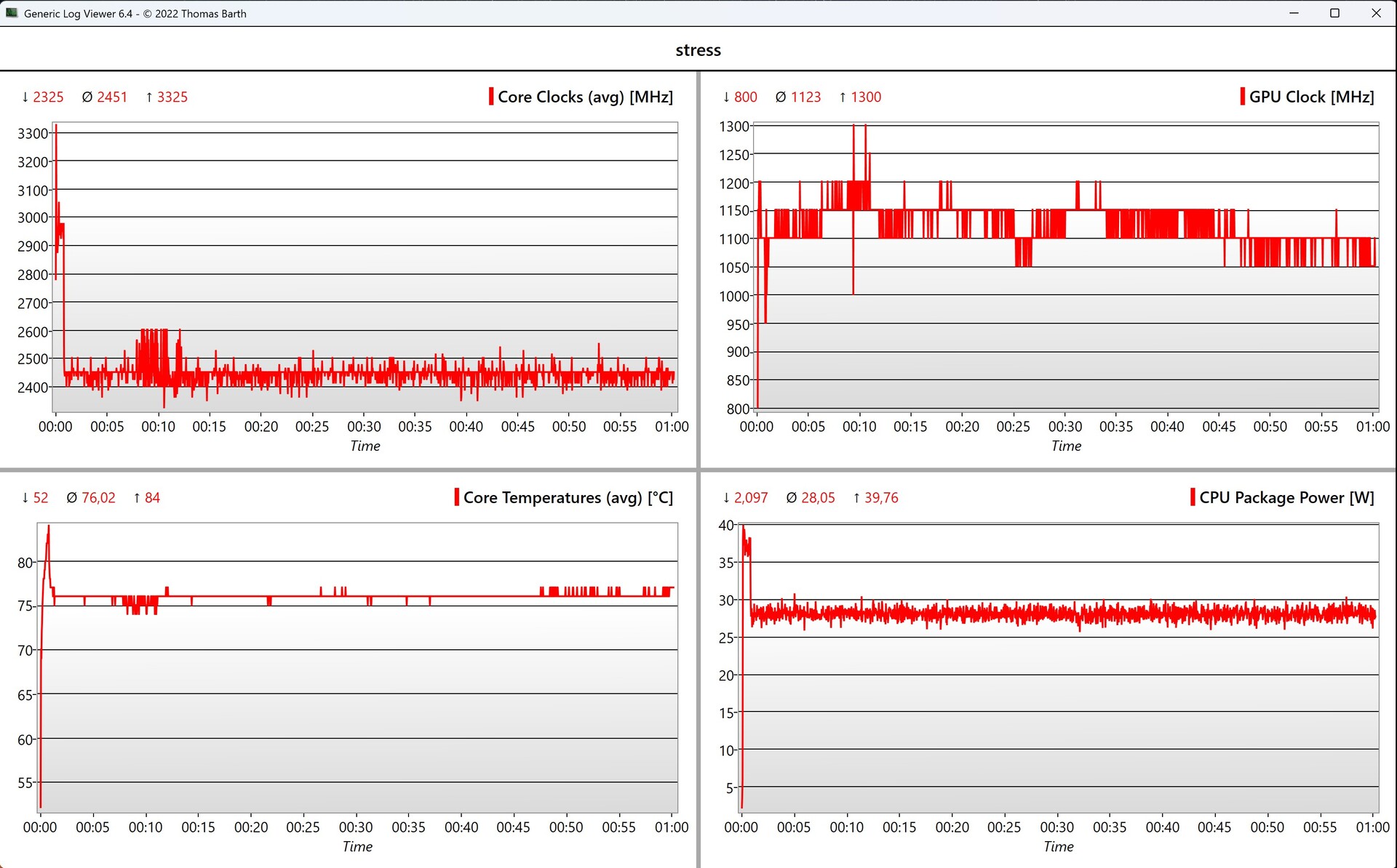 Model Lunar Lake ma przewagę w zużyciu energii nad Arrow Lake E14. Pod obciążeniem osiąga szczytową moc 61 watów, po czym szybko osiąga około 48 watów. Dołączony 65-watowy zasilacz jest zatem więcej niż wystarczający.
