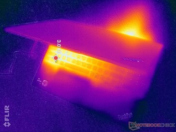 Temperatury powierzchniowe są cieplejsze na lewej połowie laptopa niż na prawej, po prostu ze względu na umiejscowienie procesora i rozwiązania chłodzącego wewnątrz. Gorące punkty podczas uruchamiania wymagających obciążeń mogą osiągnąć do 38 C i 45 C odpowiednio na górnej i dolnej stronie, jak pokazują poniższe mapy temperatur. Wyniki są w rzeczywistości o kilka stopni C niższe niż te, które odnotowaliśmy w konfiguracji AMD, być może ze względu na głośniejszy wentylator wspomniany powyżej. Podczas gdy różnice temperatur między cieplejszymi i chłodniejszymi ćwiartkami są zauważalne w dotyku, nie są one niewygodne ani rozpraszające podczas użytkowania.