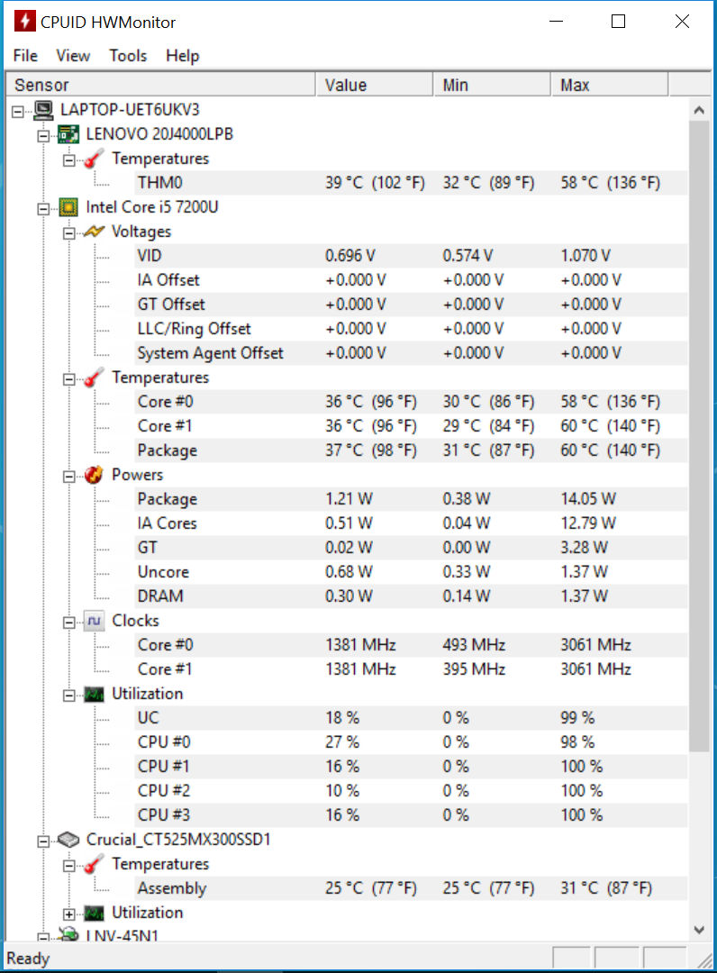 Pomimo wysokich temperatur otoczenia w czasie testów ThinkPad L470 radził sobie w aspekcie temperatur całkiem znośnie. W trakcie wykonywania zadań, do których jest stworzony, temperatura procesora dobiła maksymalnie do 60°C a na powierzchni obudowy w najcieplejszym miejscu dało się zmierzyć 32,2°C.