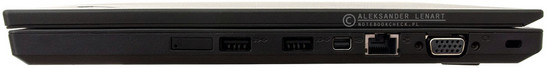 Wachlarz portów peryferyjnych jest nieco skromniejszy, niż w ThinkPadzie L570. Jest on jednak dość bogaty jak dla laptop o przekątnej ekranu 14 cali. Na wyposażeniu L470 znajdują się: trzy USB 3.0 (w tym jedno z funkcją ładowania), czytnik kart inteligentnych, port stacji dokowania (na spodzie), czytnik kart pamięci, LAN, mini DisplayPort, D-Sub, blokada Kensingtona, gniazdo SIM oraz port audio. Ze względu na ograniczoną przestrzeń zrezygnowano tu z napędu optycznego. Ponadto na wyposażeniu zabrakło gniazda ExpressCard i nowoczesnych USB 3.1 typu C oraz Thunderbolta. Rozmieszczenie portów jest dość dobre. Przednie krawędzie ścianek bocznych są wolne od portów, jeśli nie liczyć gniazda audio. Można by natomiast zwiększyć odstępy pomiędzy niektórymi złączami.