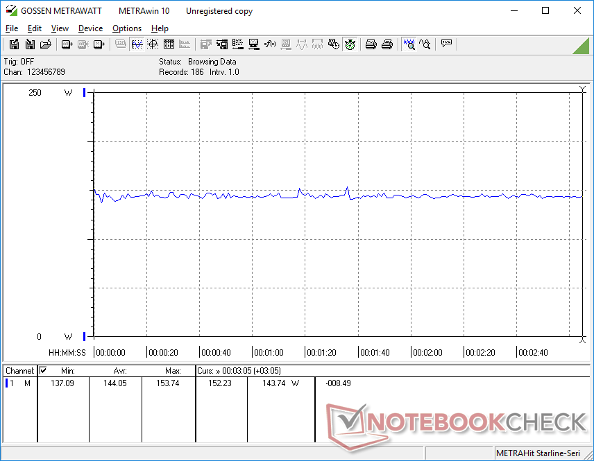 Jesteśmy w stanie zarejestrować maksymalny pobór mocy na poziomie 197 W ze średniej wielkości (~17 x 8,8 x 2,5 cm) zasilacza 230 W, gdy CPU i GPU są wykorzystywane w 100 procentach.