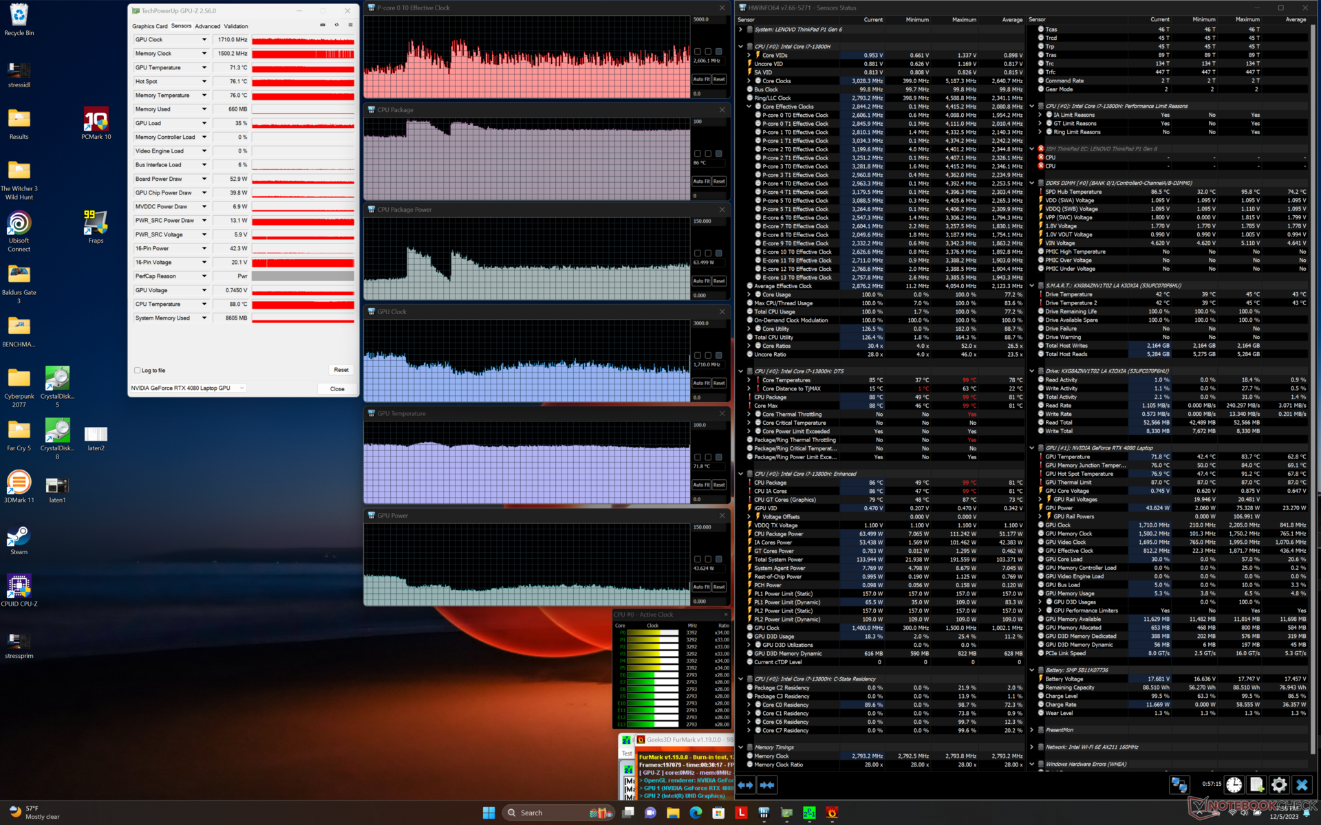 Konfiguracja szybszych opcji GPU, takich jak RTX 5000 lub nasz RTX 4080 zamiast RTX 2000, pociąga za sobą pewne wady. Ulepszenia pamięci wewnętrznej stają się bardziej ograniczone, hałas wentylatora staje się głośniejszy pod obciążeniem, a żywotność baterii zauważalnie spada. Musimy również wspomnieć o zacinaniu się liczby klatek na sekundę podczas strumieniowania wideo i stosunkowo niskim pułapie 80 W TGP. Mimo to ThinkPad P1 G6 jest jedną z najszybszych mobilnych stacji roboczych w swoim rozmiarze i wadze. Aby uzyskać coś rozsądnie szybszego, należy rozważyć bardziej masywną serię ThinkPad P16 zamiast tego.