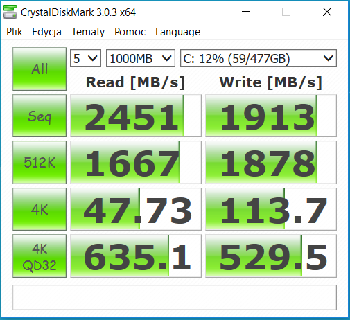 Omawiany egzemplarz ThinkPada P50 został wyposażony w bardzo bogaty zestaw magazynów danych. Jego trzon stanowią dwa półprzewodnikowe dyski o pojemności 250 GB połączone w macierz RAID. Macierz ta, na której znajduje się partycja systemowa, uzyskuje ultrawysokie transfery danych. Zmierzony w aplikacji CrystalDiskMark odczyt sekwencyjny osiągnął aż 2451 MB/s a zapis sięgnął 1913 MB/s.