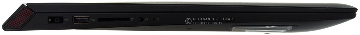 Podobnie jak w poprzednika (Y70), model Y700-17 dysponuje bardzo skromnym zestawem złączy. Muszę napisać, że jest wręcz jeszcze gorzej, gdyż zmniejszono liczbę gniazda audio z dwóch do jednego. Liczba portów USB 3.0 pozostała taka sama (są dwa podkreślone czerwoną barwą). Niestety nie zmodernizowano ostatniego złącza USB 2.0. Nie dodano nowoczesnego USB 3.1, ani wyjścia DisplayPort. Jedynym atutem Y700-17 w kategorii portów peryferyjnych może być ich rozmieszczenie (są zgrupowane w tylnych częściach bocznych ścianek laptopa).
