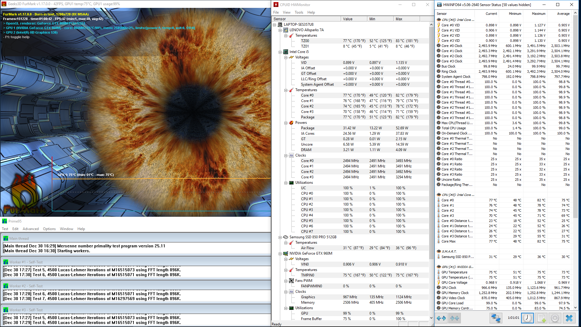 Podobnie jak w mniejszym modelu Y700-15, w Y700-17 nie zaobserwowałem większego dławienia taktowania procesora, ale dane z aplikacji HWiNFO z testu pełnego obciążenia wskazują na spadek częstotliwości taktowania do 2,5 GHz, czyli o 100 MHz poniżej wartości bazowej (o utrzymywaniu trybu turbo nie ma nawet mowy).