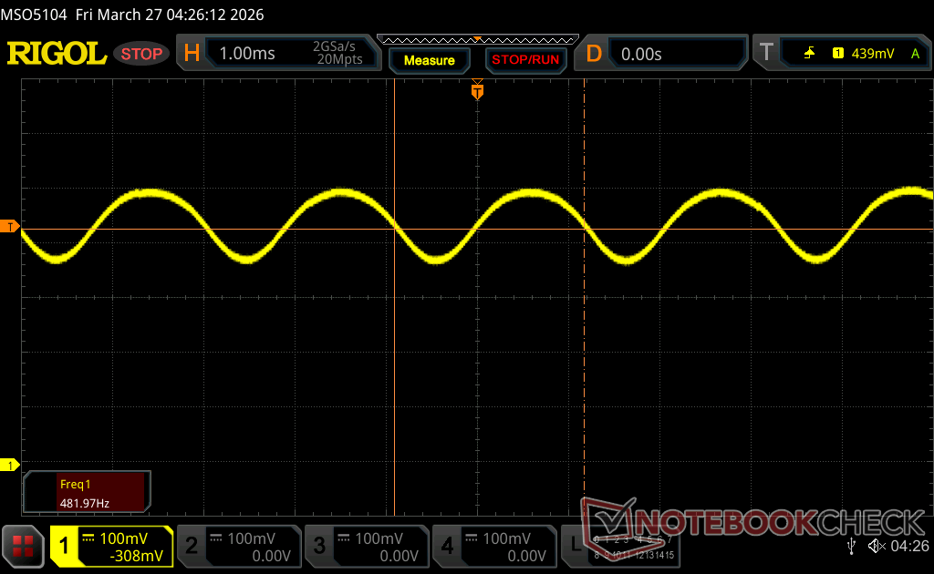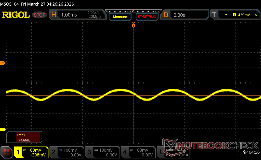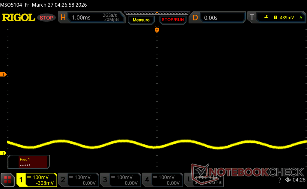 Podświetlenie wyświetlacza miga z częstotliwością 474.6 Hz (najgorszy przypadek, np. przy użyciu PWM) Wykryto migotanie przy ustawieniu jasności 100 % i poniżej. Powyżej tego ustawienia jasności nie powinno być żadnego migotania ani PWM. Częstotliwość 474.6 Hz jest stosunkowo wysoka, więc większość użytkowników wrażliwych na PWM nie powinna zauważyć żadnego migotania. Istnieją jednak doniesienia, że niektórzy użytkownicy są nadal wrażliwi na PWM przy częstotliwości 500 Hz i wyższej, więc należy zachować ostrożność. Dla porównania: 53 % wszystkich testowanych urządzeń nie używa PWM do przyciemniania wyświetlacza. Jeśli wykryto PWM, zmierzono średnio 7962 (minimum: 5 - maksimum: 343500) Hz. | |||