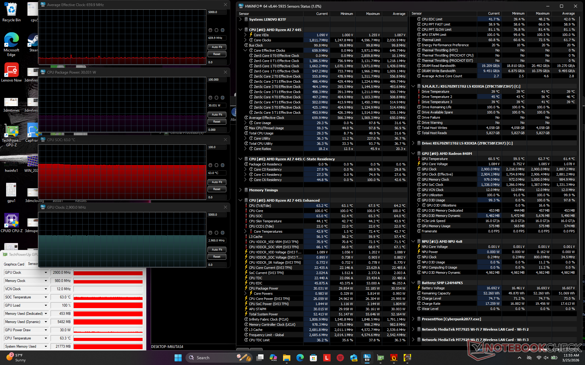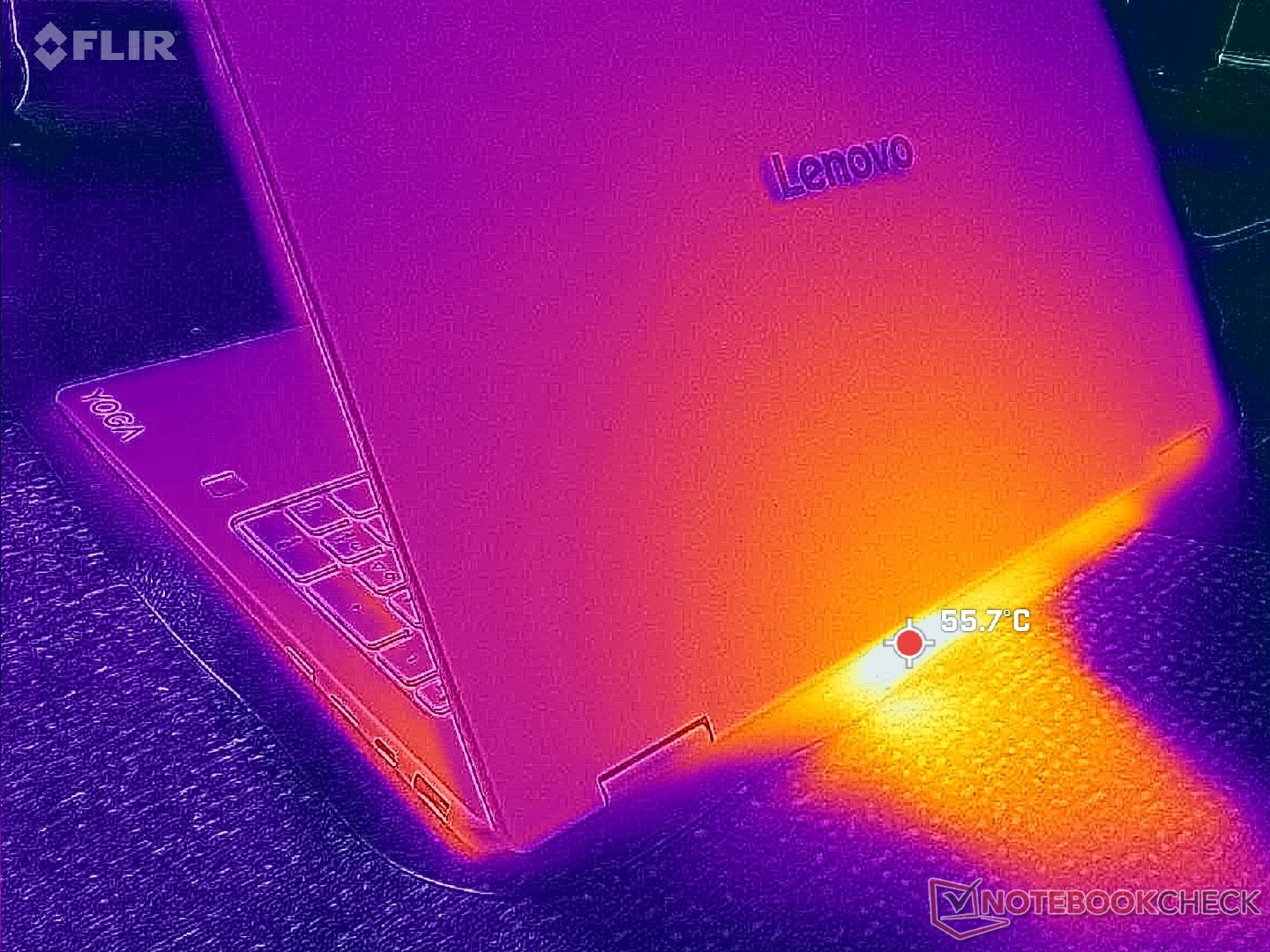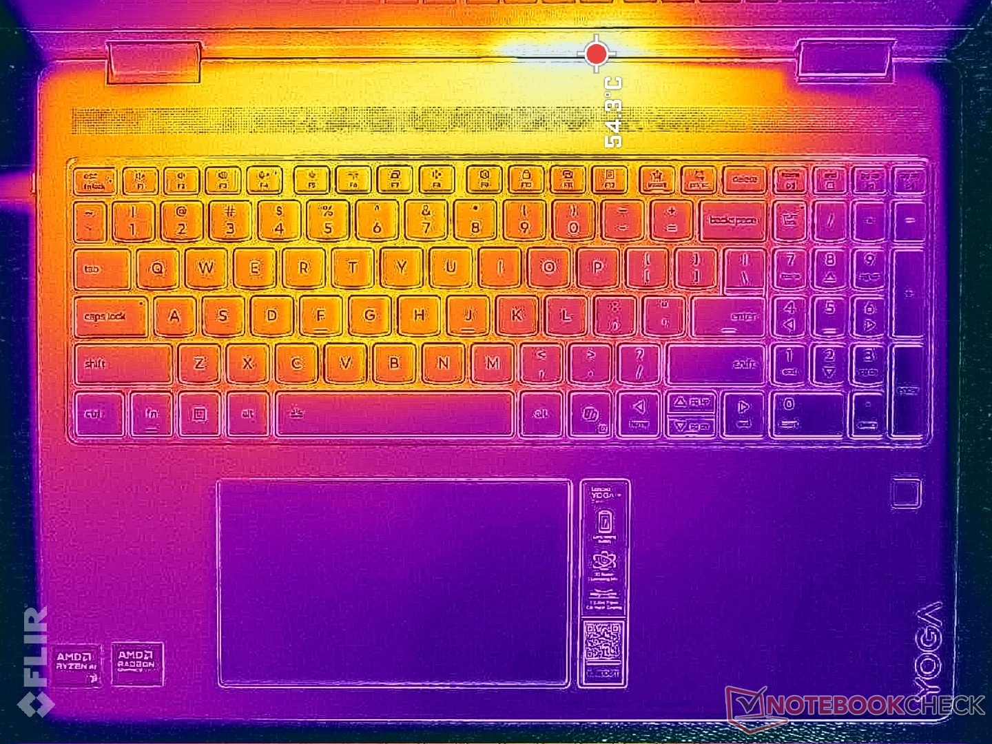 Temperatury powierzchni mogą być wyższe niż w przypadku konfiguracji Lunar Lake-V. Podczas uruchamiania wymagających obciążeń, takich jak na przykład gry, gorące punkty na klawiaturze i dolnej pokrywie mogą osiągnąć odpowiednio ponad 48 C i 45 C, w porównaniu do 43 C i 37 C w opcji Intela.