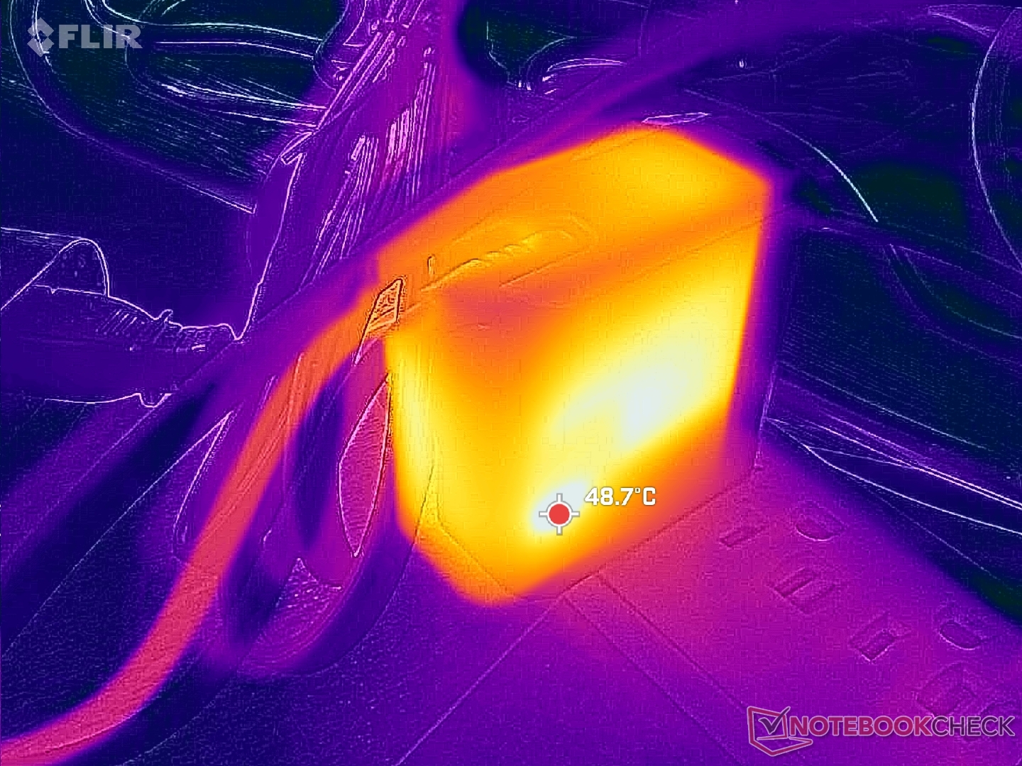 Jesteśmy w stanie zmierzyć tymczasowy maksymalny pobór 69 W z małego (~ 5,5 x 5,5 x 2,9 cm) zasilacza sieciowego USB-C o mocy 65 W, gdy procesor jest w pełni obciążony.