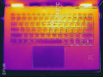 Podczas pracy bez obciążenia temperatury obudowy były bardzo niskie, tylko niewiele wyższe od temperatury otoczenia. W teście ekstremalnego obciążenia Yoga 920 nie zrobiła się ekstremalnie gorąca, ale trzeba odnotować, że w środkowej części klawiatury zmierzono 44,4°C. Na szczęście na obszarze podnadgarstnika temperatury nie przekroczyły 32°C.